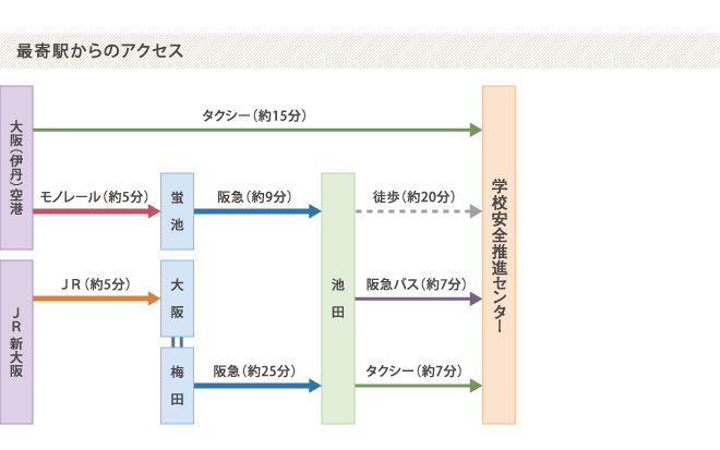 | 阪急バス | 約7分 ※池田駅東のりば2番より、下渋谷経由のバスに乗車 (系統3、4)、「下渋谷」停留所で下車、徒歩0分 阪急バスホームページ:http://bus.hankyu.co.jp/rosen.shtml |