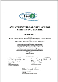 このたび、世界各地で推進するInternational Safe School(ISS)認証活動をわが国において普及・発展することを目的に、スウェーデン王国カロリンスカ研究所に設置されているWHO地域安全推進協働センター(WHO Collaborating Centre on Community Safety Promotion:WHO-CCCSP)の承認を得て、平成24年4月14日に、インターナショナルセーフスクールネットワーク代表 マックス・ボスクラー氏、大阪教育大学長の長尾 彰夫、そして学校危機メンタルサポートセンター長の藤田 大輔との間で調印式を行い、世界で9番目となる「日本International Safe School認証センター(Japan International Safe Schools Certifying Centre, WHO-CCCSP)」を設立することになりました。