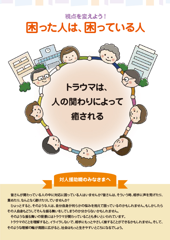 困った人、障害をもっている人などに対してトラウマの理解を深めることが優しい社会づくりにつながることを目的に作成したパンフレットです。